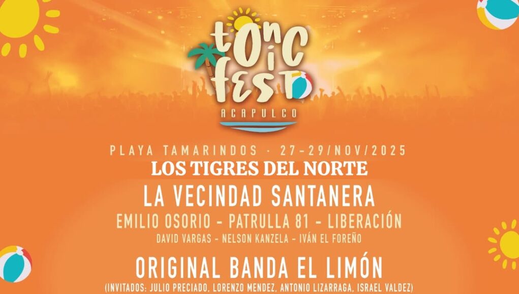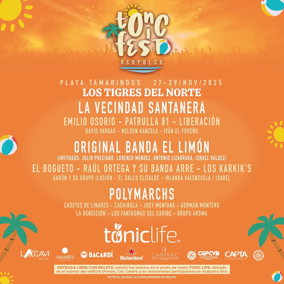 El festival Tonic Fest se celebrara en Acapulco del 27 al 29 de noviembre con estrellas de talla internacional como Los Tigres del Norte, Polymarchs, La Sonora Santanera, El Foreño, Marlon Colmenares y muchos más, en Playa Tamarindos, es un evento que no sé lo pueden perder.